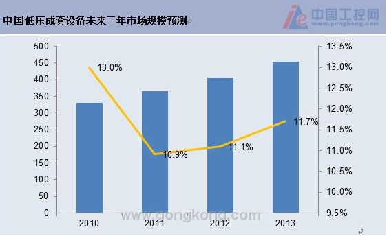 中國低壓成套設備市場未來三年將保持穩定增長 低壓成套設備市場經歷了2010年良好的增長,隨著智能電網的建設實施以及新能源行業的發展,未來幾年將保持穩定的增長,增長率在11%左右。