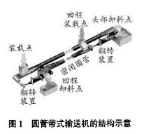 圓管帶式輸送機的結構原理見圖1,在輸送機的尾部通過裝料器給輸送機裝載,輸送帶經過尾部滾筒后成為普通輸送帶的平形,用若干組過渡托輥將平形的輸送帶逐漸導向成封閉的圓形截面,從而實現密閉輸送物料。為了卸料,在輸送機的頭部仍然通過過渡托輥的導向,將圓形輸送帶導向成平形輸送帶,在輸送機的頭部實現卸料。理論上,輸送機可以進行雙向輸送物料,但是通常需要增設輸送帶翻轉裝置。與其它密閉帶式輸送機和通用帶式輸送機相比,圓管帶式輸送機因其所特有的結構形式,具有明顯的特點。