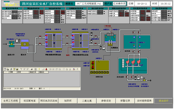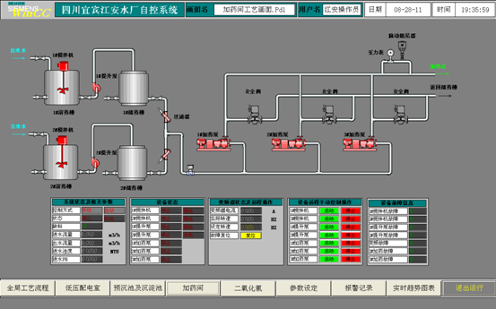 2、 操作畫面 所有的操作畫面都包括三部分,包括:畫面標題欄、主畫面、畫面菜單欄。 畫面標題欄顯示有:工程名稱、畫面名稱、用戶名、日期、時間; 主畫面為對應畫面名稱的監控畫面; 畫面菜單欄為各畫面切換按鈕及退出運行按鈕; 系統操作主畫面共有8幅,包括:“全局工藝流程”、“低壓配電室”、“預沉池及沉淀池”、“加藥間”、“二氧化氯”、“參數設定”、“報警記錄”、“實時趨勢圖表”,子畫面1幅,為“實時數據表”。其中為“全局工藝流程”為主操作畫面,即開機運行畫面。 所有畫面中,設備運行狀態為綠色表示運行,紅色表示停止,如:1#攪拌機運行,狀態框中文本顯示“運行”,且字體顏色為綠色,畫面中1#攪拌機圖形符號為綠色;1#攪拌機停止,畫面狀態框中文本顯示“停止”,且字體顏色為紅色,畫面中1#攪拌機圖形符號為紅色。設備運行條件為綠色表示允許,紅色表示禁止,如1#攪拌機選擇就地控制時,畫面中顯示紅色“就地”,即上位機不能操作;當1#攪拌機選擇遠程控制時,畫面中顯示綠色“遠程”,即上位機可以操作。設備報警信息為綠色表示正常,紅色表示故障。如:加藥間“1#攪拌機故障”顯示框內,無故障時顯示綠色“否”,有故障時顯示紅色“是”。 所有畫面中,當鼠標指向可操作對象時,對象背面會出現綠色閃電,表示該對象可點擊操作。 (1) 全局工藝流程
