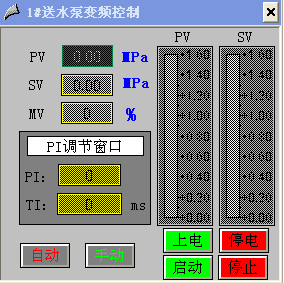 1#~2#回水池潛污泵當選擇遠程控制時,點擊“自動”或“手動”按鈕選擇遠程控制方式,系統默認為遠程手動,當選中了相應的控制方式后,字體顏色變為綠色,然后點擊按鈕啟停設備。