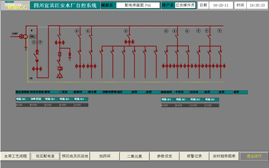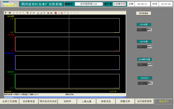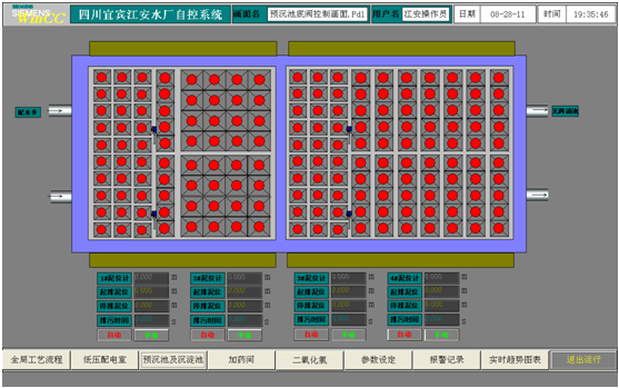 此畫面為整個水廠用電負荷監測畫面,通過此畫面各電流值,可以反映出各設備的用電負荷,如果上位機與現場儀表顯示有差異,以現場儀表現場為主。 (3) 預沉池及沉淀池