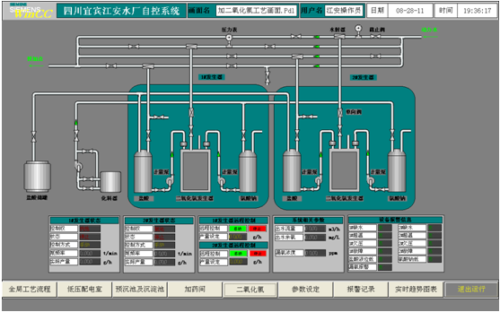 此畫面為加藥間工藝流程畫面,主要是對加藥間設備狀態參數進行顯示,及對加藥間單個設備進行遠程手動控制。當狀態參數中“控制方式”中“手動”顯示為綠色,“狀態”中顯示綠色“遠程”,表示現場柜選擇遠程手動控制,此時可通過“遠程設備手動操作控制”菜單欄中“啟動”、“停止”按鈕對設備進行遠程手動操作,還可以設定變頻器頻率及操作變頻器遠程故障復位。 (5) 二氧化氯