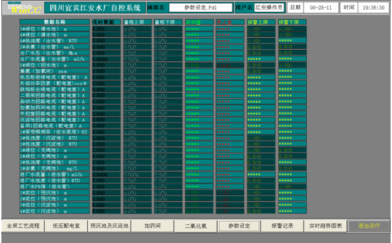 此畫面為“實時趨勢圖”中的子畫面,兩個畫面可以相互切換觀察,是設備運行數據的表格記錄,和趨勢圖相對應。同樣通過工具欄菜單,可以對數據記錄表格進行查詢和打印等操作。 六、 操作流程 (一)、上電 1、 加藥間和二氧化氯控制柜通電 分別打開柜門,合上電源總空開。 2、 子站柜通電 子站控制室有5臺ET200子站柜,每臺柜內分別配有在線式(當有市電時,由市電供電,無市電時,由UPS供電)UPS備用電源。首先開啟UPS電源(操作詳見UPS說明書),再合上柜內電源開關,所有電源開關用途在開關上都標有文字說明。在墻上配電盒內有池底閥電磁閥的電源開關。子站柜電源從沉淀池儀表亭旁控制柜引入。 3、 PLC主站柜通電 同上,不在贅述。 4、 集控室通電 集控室2臺打印機、1臺投影儀、2臺主機及顯示器、開關電源和交換機都是由UPS供電。先開啟UPS電源,再開啟主機及顯示器,投影儀通電自啟動,斷電時,先關主機及顯示器,后關UPS電源。 (二)、啟動 1、在確保各設備一切正常的情況下,通過現場軟啟動柜開啟取水泵,注意觀察電機電流及泵、閥的實際工況。 2、當源水進入配水井后,注意配水井儀表亭內水池的水位,調整排水閥使水位保持淹沒PH檢測頭。首次調整好后,以后無需再動。 3、當源水進入預沉池及沉淀池后,開啟加藥機和池內攪拌機,觀察絮凝效果。首次進水時,水流及水質不穩定,污泥傳感器顯示參數跳變較大,不宜使用自動排泥控制,應選擇為手動排泥,當顯示穩定后,才能使用自動排泥控制。 4、當沉淀水進入無閥池后,觀察沉淀后水濁度,開啟加二氧化氯系統。 5、當水經無閥池進入清水池后,觀察虹吸處理及加氯后水濁度及余氯。 6、正常情況下,系統使用變頻泵恒壓供水,軟啟動泵只作為變頻故障時應急使用,具體操作如下: (1)變頻泵自動 首先,關閉其余2臺軟啟動泵的出水閥,打開變頻泵出水閥。畫面中點開變頻控制畫面,點擊“上電”和“自動”按鈕,設定SV(管網設定壓力)壓力,點擊“啟動”即可,系統送水泵自動恒壓控制。停機時先點擊“停止”,再點“停電”。注意!變頻器上電后有20秒自檢時間,自檢后才能操作。 (2)變頻泵手動 首先,關閉其余2臺軟啟動泵的出水閥,打開變頻泵出水閥。畫面中點開變頻控制畫面,點擊“上電”和“手動”按鈕,設定MV(頻率百分比)百分比,點擊“啟動”即可,系統送水泵按設定頻率百分比運行,50Hz對應100%,0Hz對應0%,注意!此時控制的是頻率即電機轉速,和輸出水壓無關,要注意水壓變化,避免水壓過高。停機同上。 (3)軟啟動泵手動 首先,關閉其余2臺泵的出水閥,打開準備運行泵出水閥。注意!軟啟動遠程控制時,軟啟動上電需就地操作完成。然后畫面中點出控制窗口,點擊“啟動”按鈕即可。水泵啟動后,手動緩慢打開該泵出水閥,使出水壓力達到規定值,停止開閥。建議不要在出水閥開啟狀態下啟動軟啟泵,因為水泵工頻運行時對管網沖擊很大。停機點擊“停止”即可。
