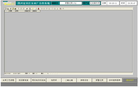 此畫面為整個系統報警記錄,包括設備的故障報警、超出參數上下限設定的超限報警等等。系統產生報警信息后,可以點擊報警表工具欄確認按鈕,可以逐一確認,也可以成批確認,如果報警信息消除,說明數據報警已解除;如果報警信息還存在,說明數據報警還未解除。此報警記錄和“全局工藝流程圖”中相同。