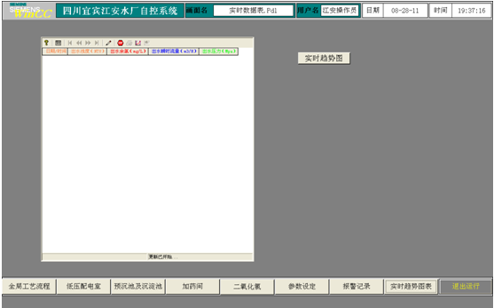 此畫面為設備運行數據的趨勢圖,具體包括:出水濁度、出水瞬時流量、出水累計流量、出水壓力。每個趨勢圖X軸為時間軸,Y軸為數值軸,數值軸為自動量程適應(趨勢圖會根據數值的實際值自動確定量程)。在工具欄中可以對歷史數據進行打印查看等操作。 (9) 實時數據表