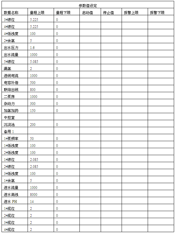 此畫面是所有的在線監控參數的量程值、啟停值、上下報警值的設定。量程值調試好后,正常運行中無需修改,啟停值和上下報警值用戶根據實際工況設定。(單位詳見畫面中)