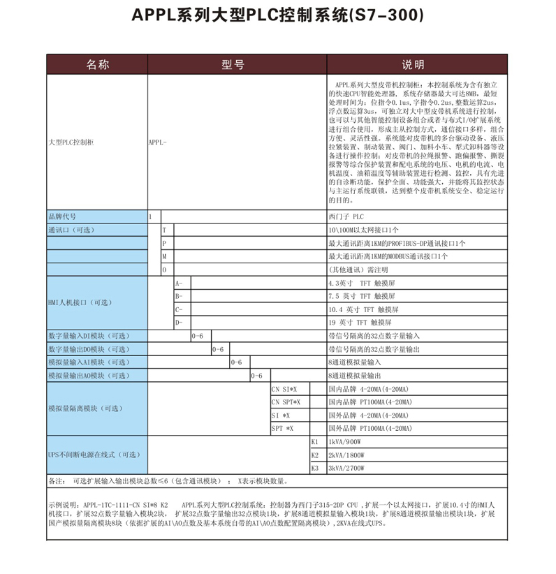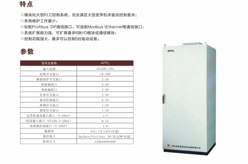 本控制柜為含有獨立的快速CPU智能處理器,系統存儲器最大可達8MB,最短處理時間為:位指令0.1us,字指令0.2us,整數運算2us,浮點數運算3us,可獨立對大中型皮帶機系統進行控制,也可以與其他智能控制設備組合或者與布式I/O擴展系統進行組合使用,形成主從控制方式,通信接口多樣,組合方便、靈活性強。系統能對皮帶機的多臺驅動設備、液壓拉緊裝置、制動裝置、閥門、加料小車、犁式卸料器等設備進行操作控制;對皮帶機的拉繩報警、跑偏報警、撕裂報警等綜合保護裝置和配電系統的電壓、電機的電流、電機溫度、油箱溫度等輔助裝置進行檢測、監控,具有先進的自診斷功能,保護全面、功能強大,并能將其監控狀態與主運行系統聯鎖,達到整個皮帶機系統安全、穩定運行得目的。