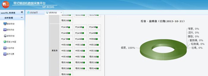 帶式輸送機數據采集平臺由現場工況顯示,實時數據采集,歷史數據分析三大部分構成。在設備現場,井口,井下等重要生產運行地點分別安裝相關儀器、儀表,實現現場數據采集、重要數據存儲等功能;并通過專用網絡,將現場采集的數據遠程傳輸至監控中心;在監控中心的服務端,實現大數據的快速處理與分析。整個平臺的功能菜單包括現場組態顯示、數據采集、遠程控制、數據存儲、數據分析、實時監控、實時工況診斷、實時產量計算、生產報表等模塊,有效解決由于生產環境和信息滯后導致的效率問題。