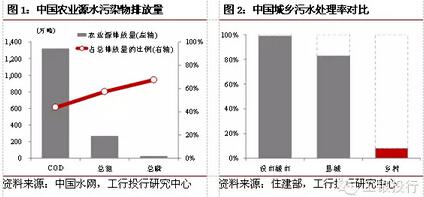 2. 上山下鄉,到農村去 長期以來,在我國農業領域的環保問題一直沒有得到充分的重視,但實際上這一領域的污染問題已經相當突出。在水體污染方面,目前農業源占我國COD排放量的比例超過40%,占總氮排放的比例在60%左右,占總磷排放的比例更是高達70%左右。 目前我國農業水污染治理程度嚴重偏低,還處于起步階段。據統計,我國僅北京、天津、上海、江蘇、浙江、廣東等少數發達省市的農村生活污水處理率能夠超過10%,其他大部分省份還未全面鋪開。在我國環境承載能力日益逼近上限的現狀下,農村環境治理問題開始受到最高層重視,近年來,國務院、環保部、財政部、發改委在多個文件中均重點提及,而農業部近日下發的《關于打好農業面源污染防治攻堅戰的實施意見》更是給出了一個較為全面的實施路線圖。