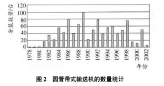 圓管帶式輸送機輸送的物料品種涉及煤炭、糧食、水泥、預制混泥土、工業灰渣,肥料、礦石、木屑、油焦、印泥等多種散狀物料,服務行業涵蓋了水泥生產、礦山運輸、加工業原料輸送、電力設備供煤、垃圾處理等多種工業應用。從1978年第一條圓管帶式輸送機誕生以來,圓管帶式輸送已經發展了27年。截止2004年底,全球已建設了960余臺圓管帶式輸送機(其中德國的KOCH公司有150臺左右),輸送能力50-4500T/H;總運輸長度達200KM以上;管徑范圍100-700MM。圖2是截止2002年世界圓管輸送機的建造情況的統計。世界范圍內圓管輸送機的單機最大長度為5029M,最大輸送量為4500T/H。最大管徑為700MM,最大傾角30°,最大轉變角度90°,最多轉彎處數為12個,最大帶速4.7M/S。