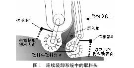 連續裝卸系統由取料頭和輸送帶組成,由取料頭從堆場取料,經帶式輸送機送到指定地點。在取料頭上,可以安裝聲波傳感器,該傳感器能夠在灰塵環境下工作,如圖1所示,傳感器1用來感或者獲取取料前物料層的表面位置,傳感器2用來感知獲取取料后物料層的表面位置。這些傳感器的獲得的數據(如瞬時上料流量、傳輸料流量等)傳到自動控制系統,控制系統根據傳輸送料流量與設定流量之間的上料流量差控制取料頭取料角和切入角的變化,選取最佳的物料表面,準確定位,并前后移動層層取料,實現高效、自動地取料。