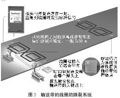 1、利用物聯網技術實時監測輸送帶的撕裂故障。裝有物料的輸送帶在調整運行中,要檢測它什么地方被撕跛了,或者有裂紋等是非常困難的。因此,有必要開發一種輸送帶的線圈防撕裂系統,如圖2所示,它包括了植入輸送帶的線圈、探頭、控制器、RFID芯片和RFID的識別器等。通過探頭可監測到線圈的脈沖信號,將檢測到的脈沖信號收集起來,用以判斷輸送帶是否發生撕裂故障然后將分析結果和圖像傳到控制室監控的屏幕上,便于及時地修整,維護,減少損失。
