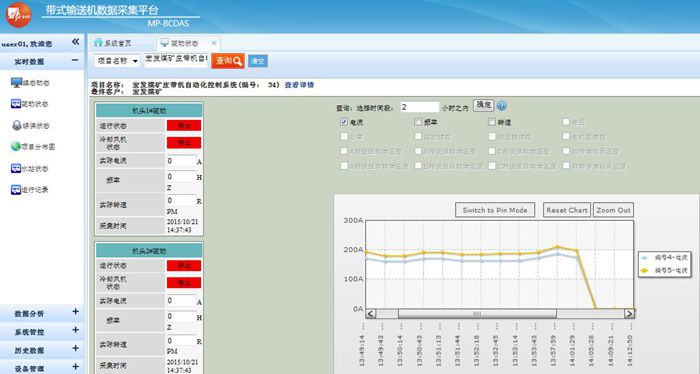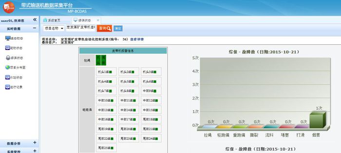 帶式輸送機數據采集平臺由現場工況顯示,實時數據采集,歷史數據分析三大部分構成。在設備現場,井口,井下等重要生產運行地點分別安裝相關儀器、儀表,實現現場數據采集、重要數據存儲等功能;并通過專用網絡,將現場采集的數據遠程傳輸至監控中心;在監控中心的服務端,實現大數據的快速處理與分析。整個平臺的功能菜單包括現場組態顯示、數據采集、遠程控制、數據存儲、數據分析、實時監控、實時工況診斷、實時產量計算、生產報表等模塊,有效解決由于生產環境和信息滯后導致的效率問題。